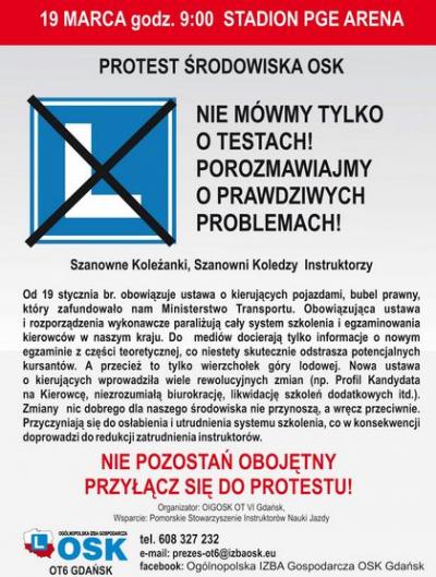 19.03.2013 odbył się w Gdańsku zapowiadany protest instruktorów nauki jazdy, którzy sprzeciwiają się złym, w ich ocenie, zapisom w Ustawie o kierujących pojazdami.Poniżej zamieszczamy przygotowaną treść protestu, która została wysłana listownie do premiera